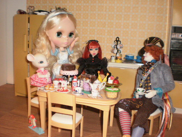 By the way, this flawed Round Bespaq tea table is on my Ebay auctions right now, shown are some pictures below. This tea table will end tomorrow- click HERE to go to the auction. Here are some photos of the item with Barbie, and Fashion Royalty dolls. It will also fit French Fashion dolls/poupees. This is the same tea table, which measures 6 inches high 9 inches wide but with a variety of different fashion dolls. This item ends tomorrow, August 31st as of this writing.