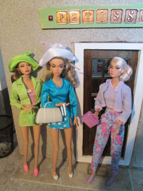 The outfits look a little better in today's styling without the hats, I am thinking of using them in the windows for Easter. Two of the outfits came with sunglasses. I haven't shown one of the outfits on a doll because it was such a disappointment, it was ill fitting and didn't look very attractive. Dark Moon looks lovely in the lavender. She has informed her name is Chloe DuBois, and will be helping Poppy plan her wedding. (She came in from the convention last year you know. Loves lavender, in the color, flowers, jewels, fabric, etc. makeup. ) I haven't had much time to bond with this lovely and feel bad about it- her eye makeup, her hairstyle, are just so timeless and gorgeous. This outfit I knew had to be hers. Though her groovy outfit she came is nice, I want to see her in some cocktail, some evening wear, and some fun casual wear too. She also just looks like a Chloe.