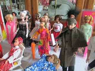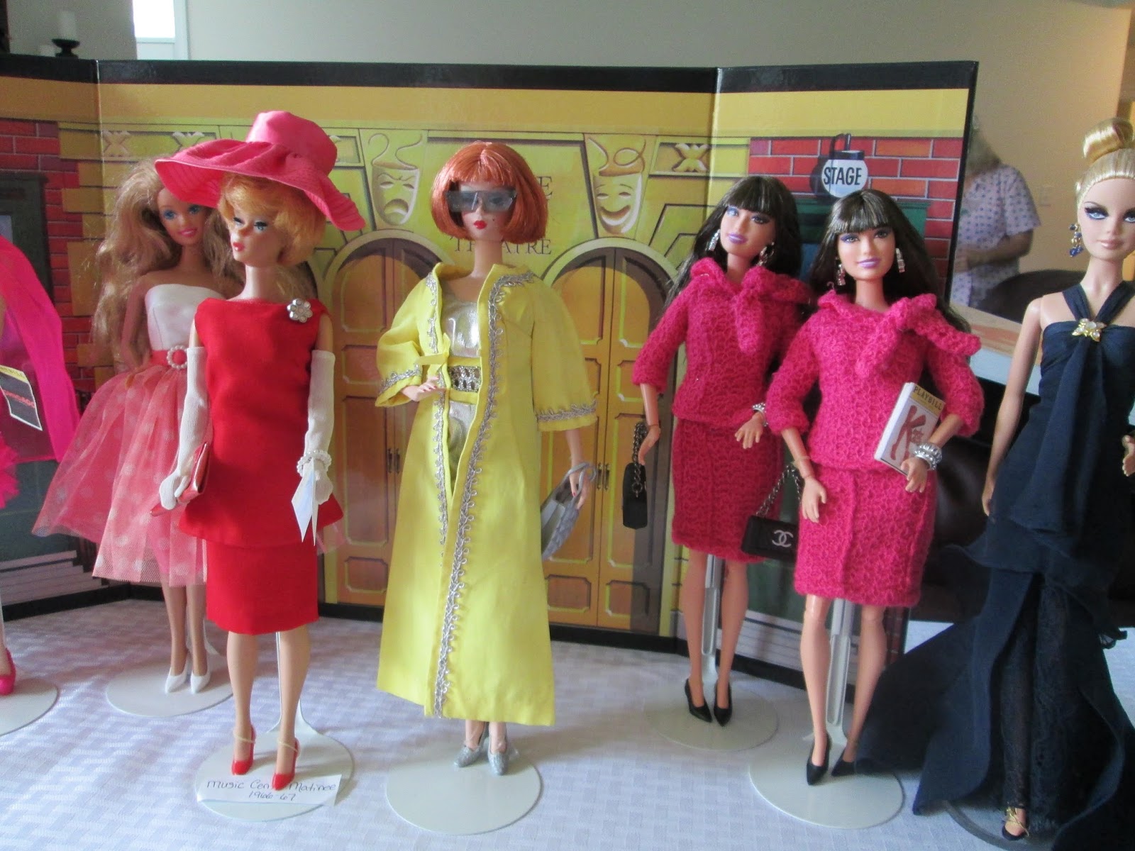 The doll int he bathing suit belongs to Jewelz, (Linda,) our club treasurer and is a No. 1 Barbie. The vintage dolls on the left are no. 3's from Janice and Debbie's collections and No. 4's on the left also from Janice and Debbie's collections and possibly from Jody's collections as well. This is such a wonderful item, I can't possibly use it. We all joke about being allowed to breathe on Jewelz' no. 1 Barbie! She is lovely and her husband purchased her for her on her birthday.
