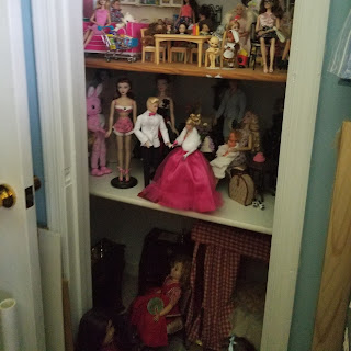 I have been working so hard for the past 10 days emptying out our storage unit of the store fixtures and old items, and treasures. It has been massive finding places to bring these items home and store them . I had to miss my doll club meeting while attending another club meeting on Sunday, which took time away from finishing the final sweeping and few boxes that needed to be brought home, but we finally finished it yesterday morning. I plan to display all of my Bespaq in my private collection from my years of selling the large scale items and finally enjoy it, and share it with others. I also have a project in the works too with some custom pieces. But the room isn't finished yet! lol. I still have some final touches to do. Lots of re-arranging and finishing to do, these are just quick snaps I took as I have been taking pics of things as I quickly arrange here and there. This room will be a very tight fit. I am working on getting ready for the multiple holidays now...Halloween, Thanksgiving and Christmas. And I still need to take photos of Mystery Date Bowling DATE! So much to do!