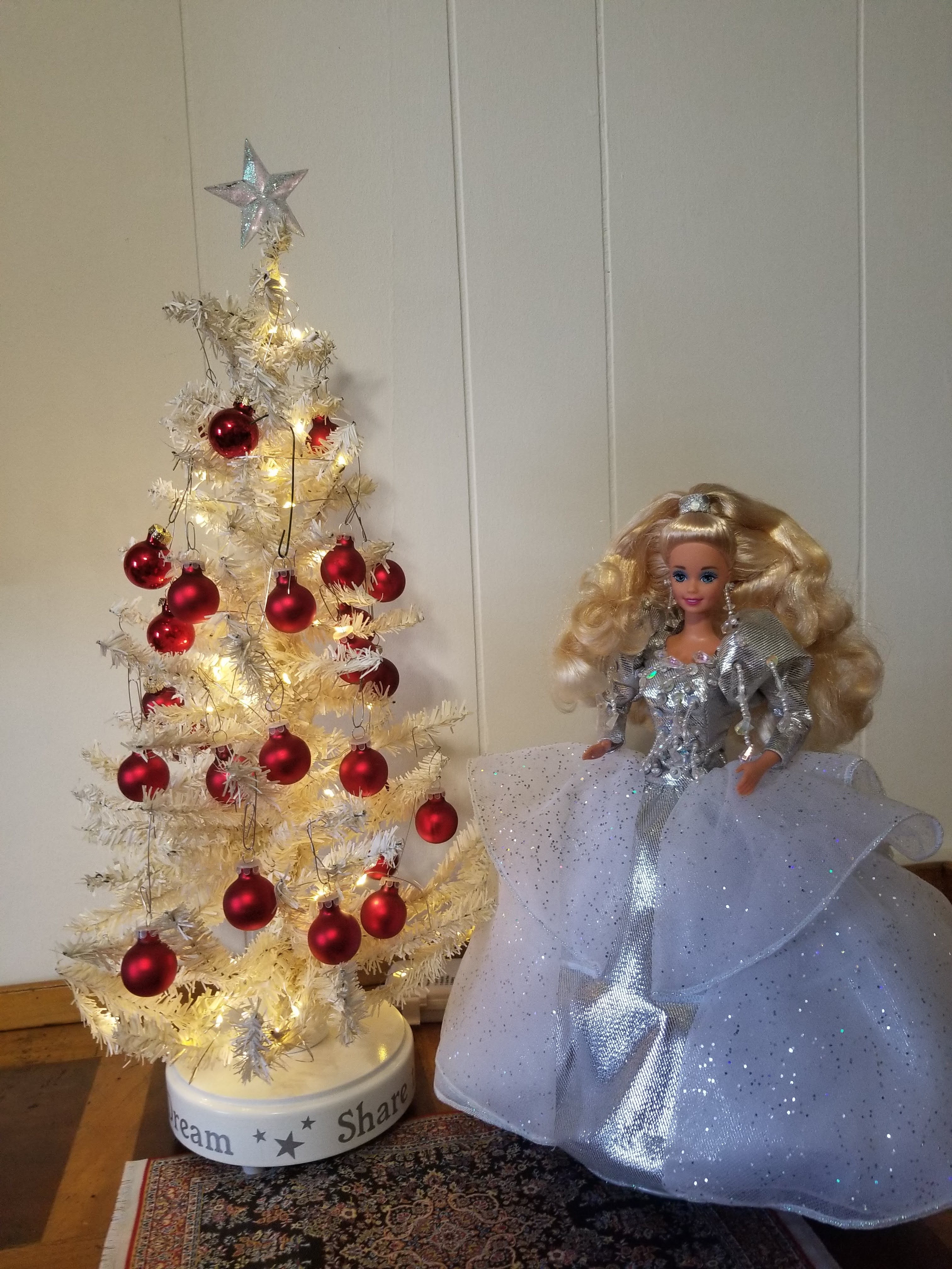 It has been a while since my last post but I have been very busy! I found this holiday Barbie from a seller on Mercari and I was watching this doll but the seller sent me an offer for her at $13 plus shipping. Of course with Mercari you have extra fees and tax so it came out to $24 at the end of the day but she came with in a damaged box with her cardboard photo, stand and shoes and brush still in the package, and she was still attached to the packaging, which I have come to prize. She is really gorgeous. Here are some photos I took today.